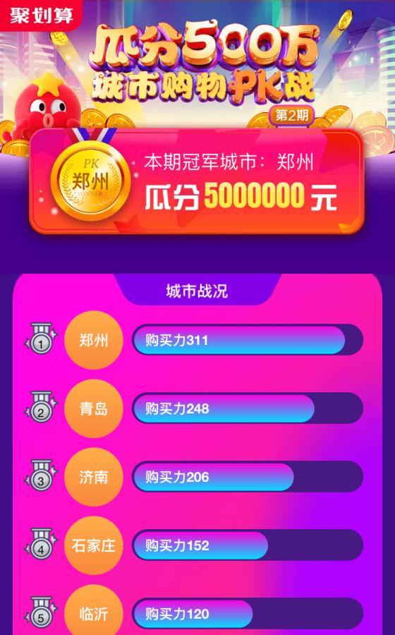 2019年5月2日至5月9日,淘寶聚劃算在濟(jì)南、青島、鄭州、石家莊等冀魯豫3省20城掀起了一場“瓜分500萬 城市購物PK戰(zhàn)”的線上電商活動,購買力最強(qiáng)的冠軍城市參與者共同瓜分了500萬紅包大獎,單人最高獎勵達(dá)到了49999元。經(jīng)過多日比拼,最終鄭州市奪得了城市購物PK戰(zhàn)的冠軍,鄭州市參與活動的用戶成為最大贏家。