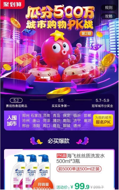 2019年5月2日,淘寶聚劃算在濟南、青島、鄭州、石家莊等20城推出了“瓜分500萬城市購物PK戰(zhàn)”的線上電商活動,活動期內(nèi)冠軍城市的所有下單用戶,可以共同參與瓜分500萬紅包,單人最高獎勵是49999元的超級錦鯉紅包,在活動區(qū)域的三四線城市中掀起了一輪全城聚力的城市購物PK風(fēng)。